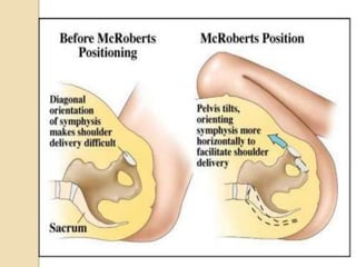 Shoulder dystocia occurs when the fetal shoulders become lodged in the birth canal during delivery after the head has been delivered, requiring additional obstetric maneuvers to assist delivery. It has an incidence between 0.23-2.09% of deliveries and can cause injuries to the baby such as brachial plexus injuries and fractures. The document outlines various maneuvers to manage shoulder dystocia including the McRoberts maneuver, suprapubic pressure, internal rotation maneuvers like Woods corkscrew and Rubins, and as a last resort, the Zavanelli maneuver which involves replacing the baby's head for c-section delivery. Advanced maneuvers should only be considered if initial maneuvers like McRobert