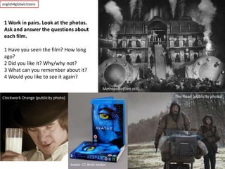 The document provides information about analyzing movie trailers and discussing science fiction films. It includes activities where students work in pairs to discuss film trailers and descriptions, match films to topics, identify quotes from a trailer, and generate a list of the top five sci-fi films. The document aims to develop students' English skills through activities analyzing visual media and having conversations about films.