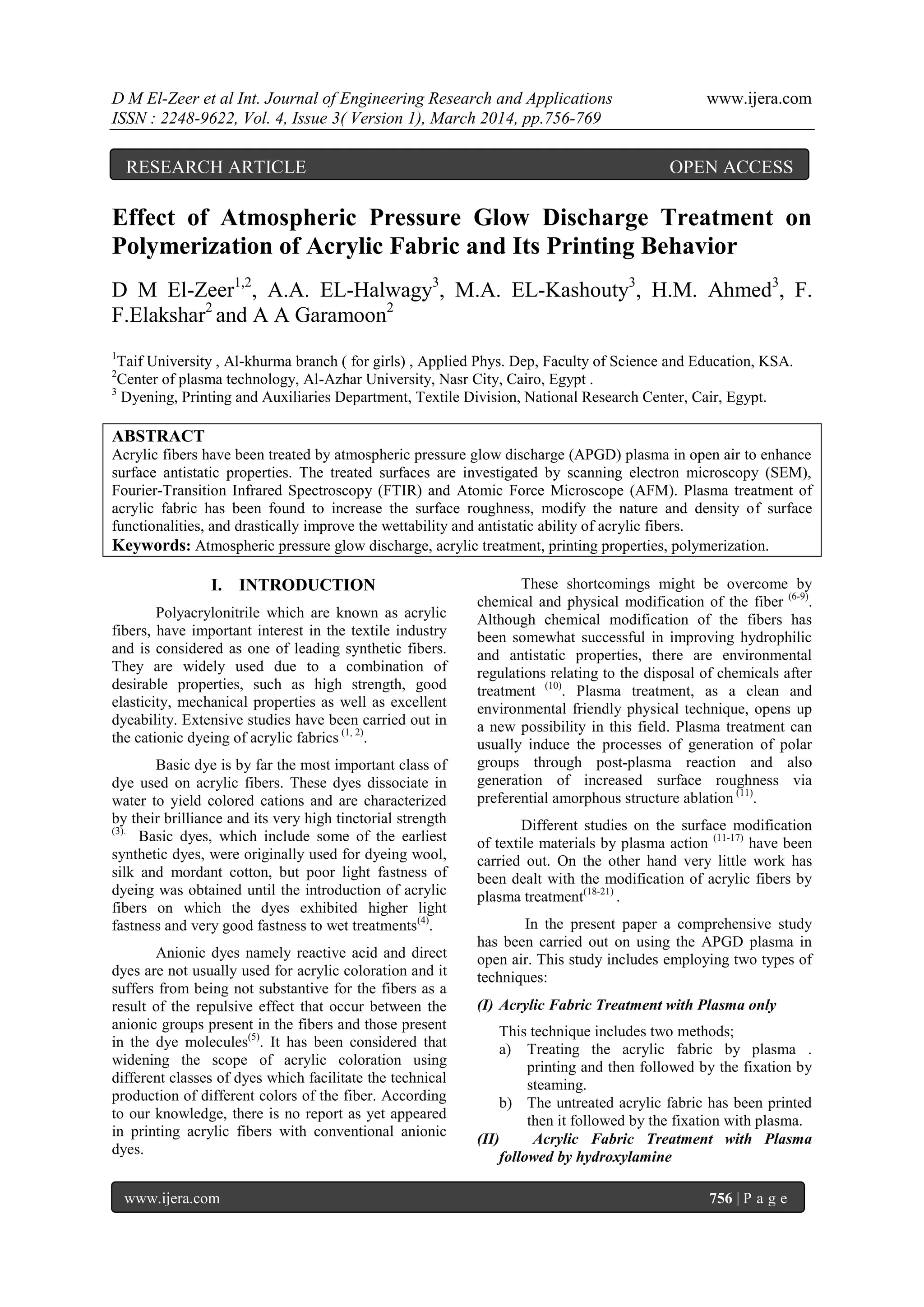 The study investigates the effect of atmospheric pressure glow discharge (APGD) plasma treatment on acrylic fabrics to improve their surface properties, including wettability and antistatic abilities. It employs various analytical techniques to demonstrate that plasma treatment significantly increases surface roughness and alters the fabric's functionality, enhancing dye fixation and printing characteristics. The findings suggest that plasma treatment is a viable alternative to chemical methods for modifying acrylic fibers in textile applications.