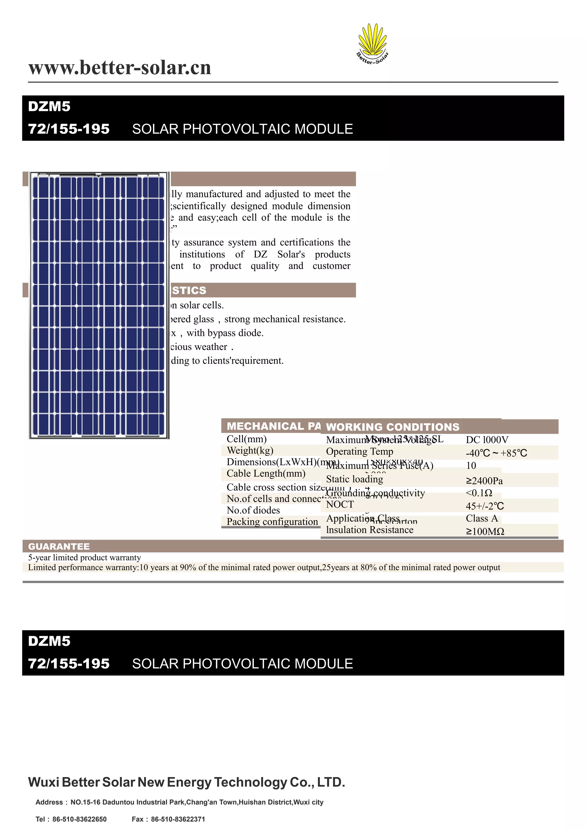 This document provides information about solar photovoltaic modules manufactured by DZ Solar. It describes the module characteristics including highly efficient silicon solar cells, tempered glass, a junction box with bypass diode, and durability in harsh weather. It also lists the mechanical and electrical parameters of the DZM5 module series, including dimensions, weight, voltage, current ratings, power tolerances, and a 5-year product warranty with 10-25 year performance warranty. Contact information is provided for Wuxi Better Solar New Energy Technology Co., the manufacturer.