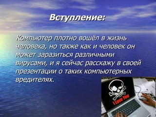 Презентация Юлии Миколюк освещает тему компьютерных вирусов и вредоносных программ, которые могут блокировать, модифицировать или уничтожать информацию на компьютере. Основные категории вредоносных программ включают сетевые черви, классические вирусы и троянские программы, каждая из которых имеет свои методы распространения и воздействия. Доклад также подчеркивает важность профилактики заражения и регулярного использования актуальных антивирусных программ.