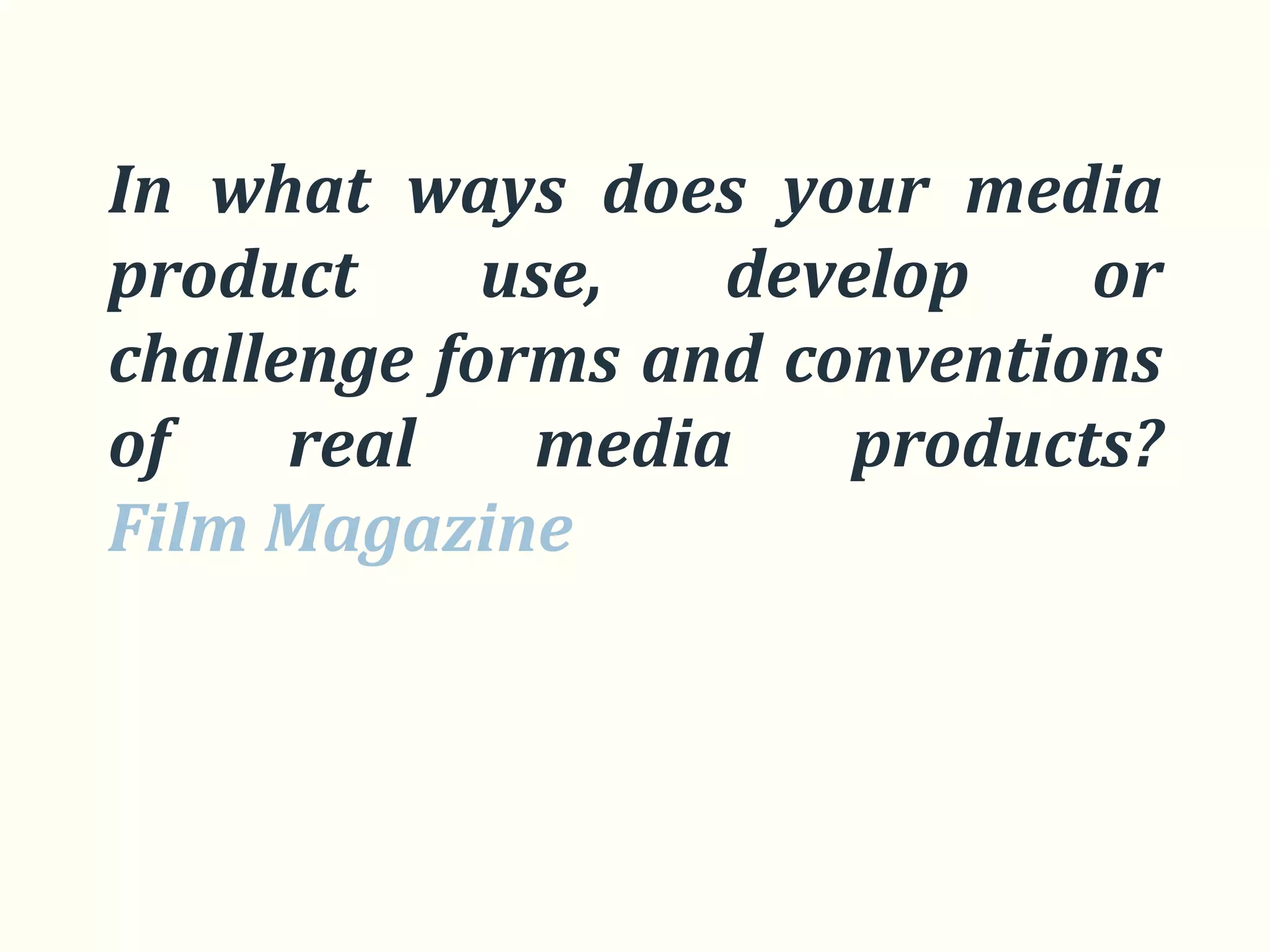 The document summarizes the key elements of magazine design conventions that were researched, such as the masthead, selling line, photo, and color scheme. It then discusses how the research was used to design a mock magazine cover for a film that challenges conventions by having a simple design inspired by the Little White Lies magazine. The cover design is then compared to the Empire magazine cover, showing how it follows conventions like prominent images and headings while putting its own spin.