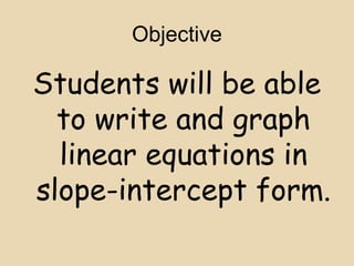The document provides instruction for students to complete a drill paper individually and silently. It then outlines the objective of writing and graphing linear equations in slope-intercept form (y=mx+b), where m is the slope and b is the y-intercept. As an example, students are asked to write the equation of a line with a slope of 1/4 and y-intercept of -6, which is y=1/4x-6. They are also asked to graph three example linear equations: y=x-2, y=-x+2, and y=-1/3x-3.