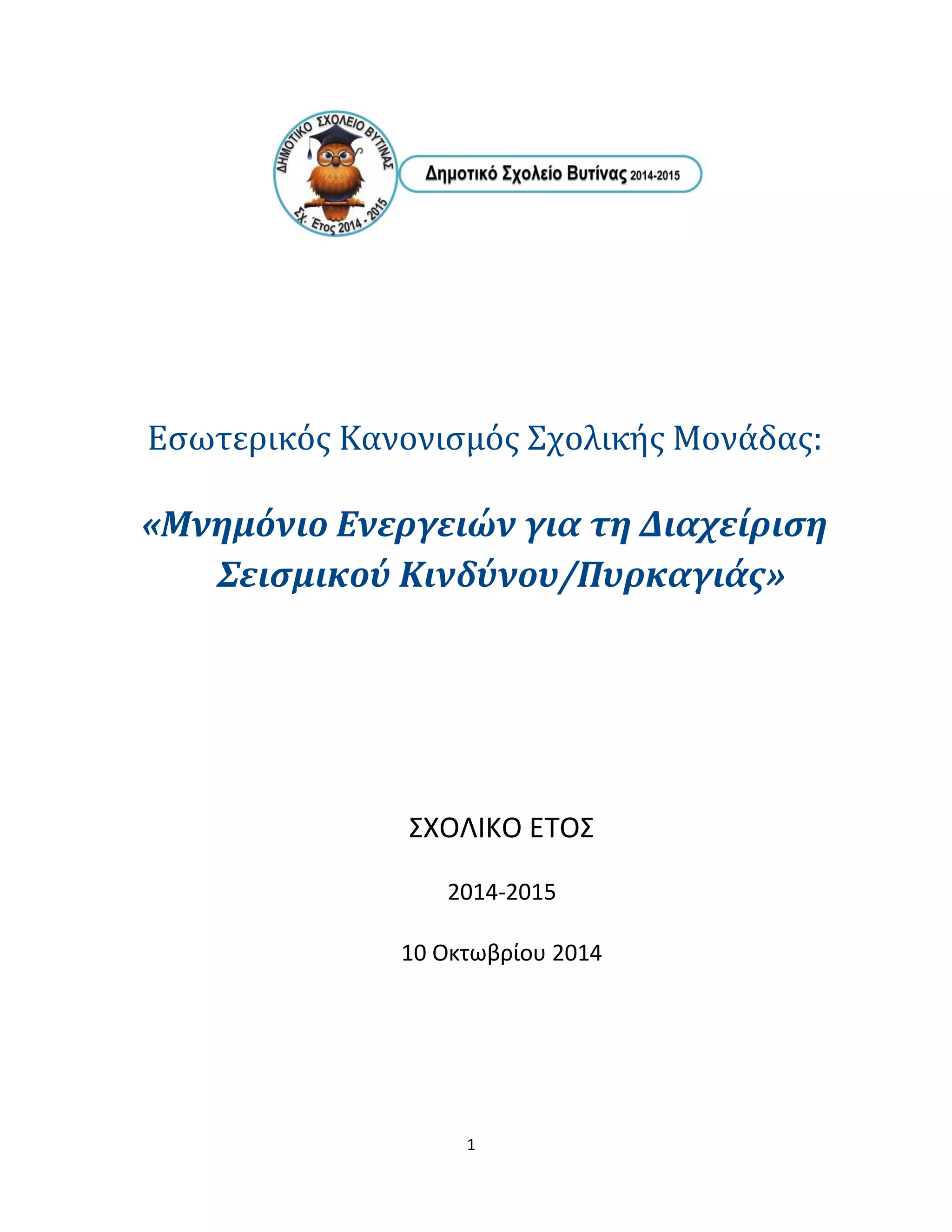 1. ΕισαγωγήΤο Δημοτικό Σχολείο Βυτίνας χαρακτηρίζεται, σύμφωνα με τις διατάξεις του Ν.Δ. 17/1974 ως Δημόσιο Ανεξάρτητο Ίδρυμα (ΔΑΙ), σε υλοποίηση της αριθμ. 107/1/158/174 οδηγίας της Δ/νσης ΠΣΕΑ Της Γενικής Γραμματείας Δημόσιας Τάξης υποχρεούται να καταρτίσει Εσωτερικό Κανονισμό Λειτουργίας. Σε εφαρμογή του εν λόγω Σχεδίου καταρτίζεται ο παρών Εσωτερικός Κανονισμός Λειτουργίας. Αποστολή αυτού είναι η προστασία των εργαζομένων και των φοιτούντων στο Σχολείο αυτό μαθητών, η προστασία του κτιριακού συγκροτήματος, του εξοπλισμού και του αρχειακού υλικού, σε περιπτώσεις εκδήλωσης εκτάκτων περιστατικών.