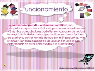 El documento describe las computadoras portátiles, incluyendo que pesan entre 1 y 3 kg, pueden realizar la mayoría de las tareas de una computadora de escritorio y operar sin electricidad por un período. Explica que en la educación se usan desde primaria hasta la universidad para conseguir información fácilmente, realizar presentaciones y tener acceso a Internet en cualquier momento. Finalmente, agradece a Miriam Flores por la información.