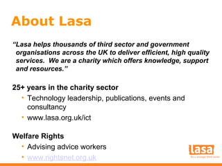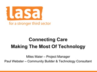 Connecting Care is a project led by Lasa, a UK charity, to promote digital inclusion among care providers. It aims to help small charitable care organizations make better use of technology. The document outlines challenges some care providers face with technology, such as lack of backups, paper-based records, and poor IT support. It also lists benefits technology can provide, such as online savings and communication tools. The project works with independent care homes, day centers and agencies, providing resources on its website about using tablets, smartphones, and other technologies for care services and communication.