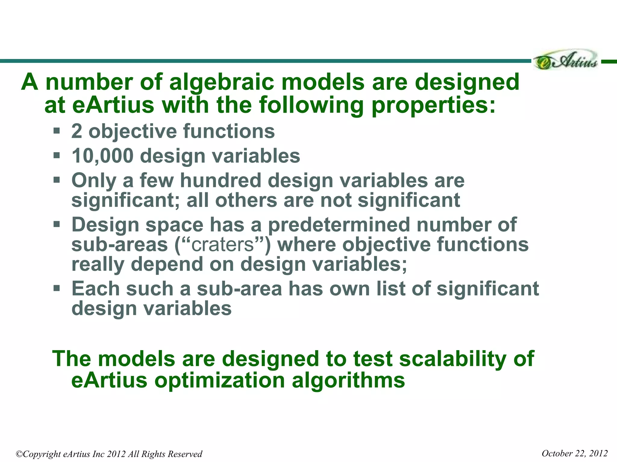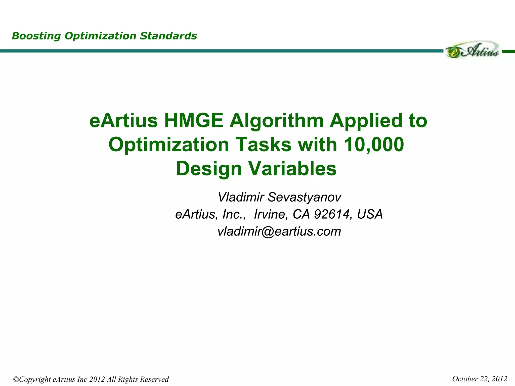 The document outlines Eartius Inc.'s Hybrid Multi-Gradient Explorer (HMGE) optimization algorithm, which efficiently handles optimization tasks with 10,000 design variables and dynamically identifies significant variables. It discusses the algorithm's method of utilizing gradient-based steps to improve convergence and detailing its effectiveness in finding Pareto optimal solutions across various multi-objective problems. Additionally, an applied engineering example demonstrates the algorithm's capability in optimizing complex thermal systems, highlighting its scalability and efficiency in high-dimensional optimization tasks.
