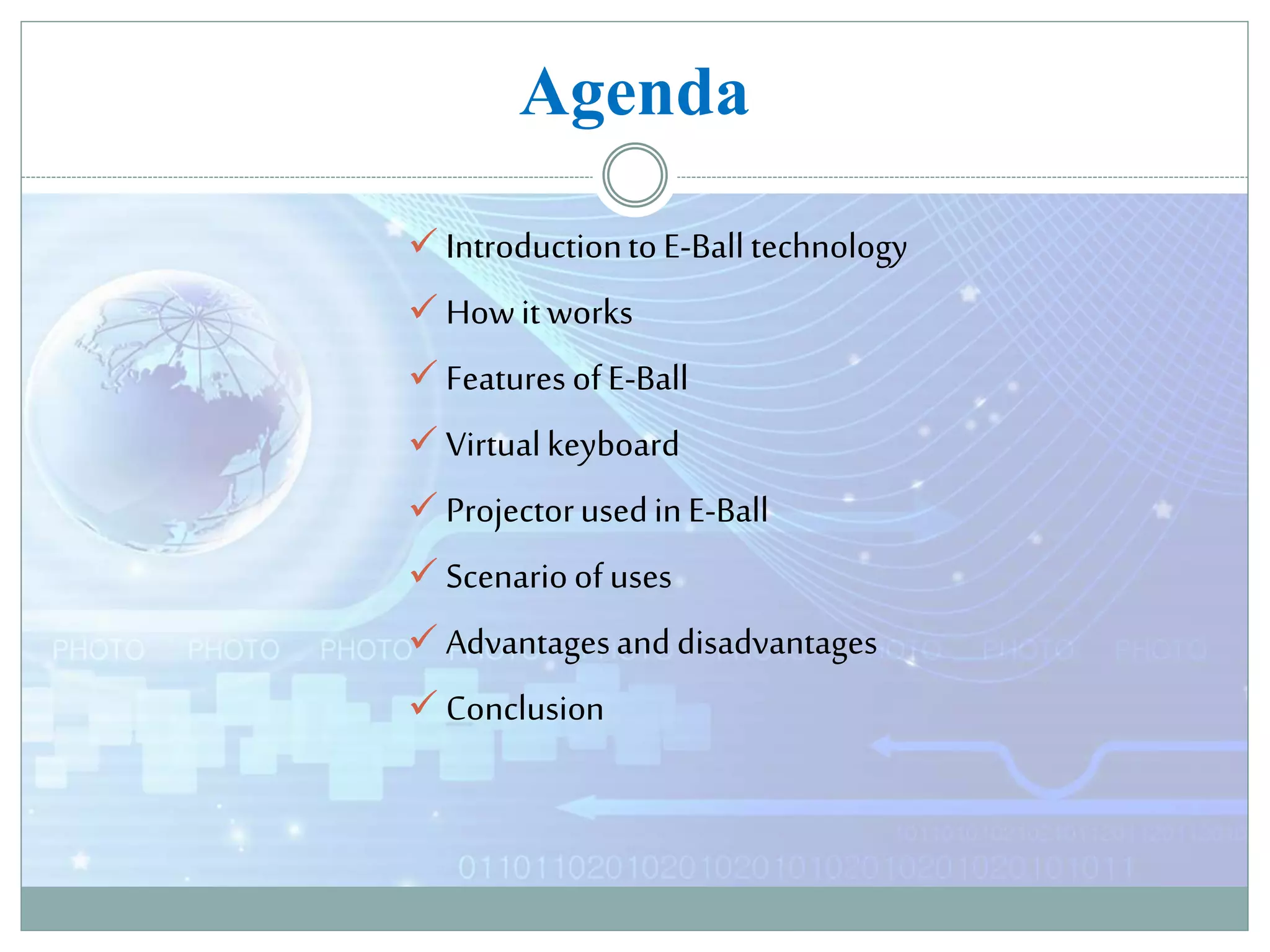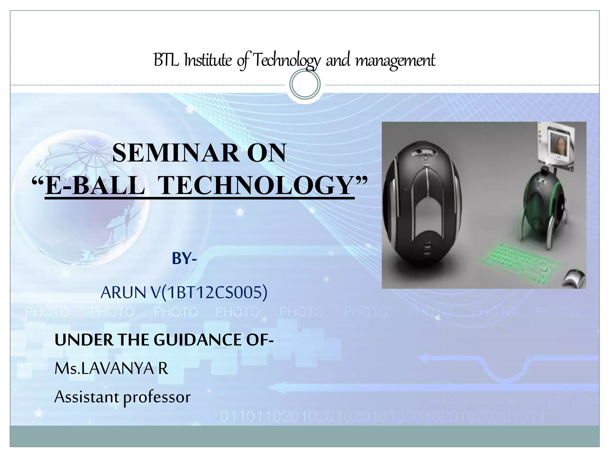 This document summarizes a seminar on the E-Ball technology. The E-Ball was designed by Apostol Tnokovski to be the smallest PC. It is a spherical computer that is 160mm in diameter. It contains all the components of a traditional computer, like a motherboard and hard drive, within its ball shape. It projects a virtual keyboard and uses a pico projector to display the screen on any flat surface. The E-Ball has advantages of portability and not needing an external display. However, it requires careful typing on the virtual keyboard and a plane surface to project the keyboard.