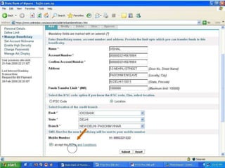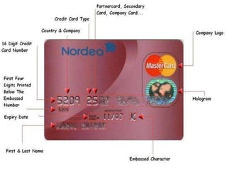 The document discusses electronic banking and differences between debit cards and credit cards. It provides details on debit cards, how they function as electronic checks withdrawing funds directly from a bank account. Credit cards are also discussed, how they allow users to revolve a balance and are charged interest. Benefits of credit cards for customers and merchants are outlined, such as incentives for customers and security compared to cash for merchants.