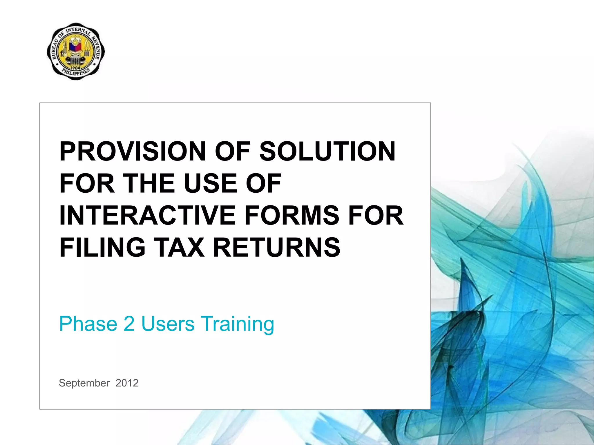 The document outlines a training for users on the Phase 2 rollout of the eBIRForms package. It discusses the project background, objectives, and timeline. Key features of the eBIRForms include automatic computations, validation of inputs, and usability. The training will cover an overview of the eBIRForms package and demonstration of how to use and submit tax returns electronically or manually.