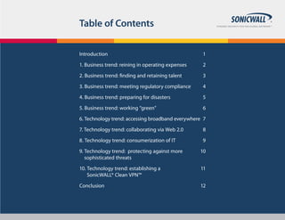 The document outlines the top 10 trends driving telecommuting, emphasizing both business and technology factors such as reducing operating expenses, attracting talent, and ensuring regulatory compliance. It highlights the importance of secure remote access technologies and the role of broadband, Web 2.0 collaboration tools, and consumer IT in supporting telecommuters. The overall conclusion is that trends in business and technology are increasingly making telecommuting a feasible and beneficial option for modern workplaces.