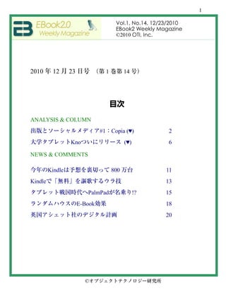 This document summarizes an issue of EBook2 Weekly Magazine. It discusses the growing popularity of e-readers like the Kindle and analyzes new devices like the Kno and PalmPad. It also covers the rising sales of ebooks, including a 250% increase in the UK in 2010. Major players in the ebook market like Amazon and new entrants like HP are analyzed in the context of these trends.