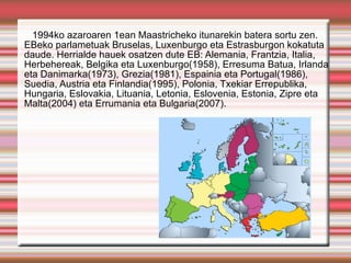 - Europako Erkidegoak (EK) Europar Batasuna (EB) izena hartu zuen.