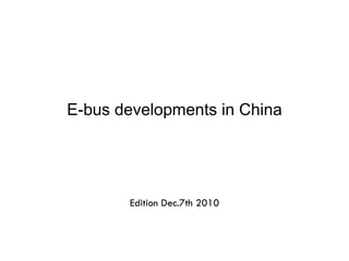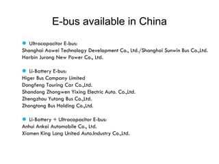 The document summarizes developments of electric buses (E-buses) in China, including those powered by ultracapacitors, lithium-ion batteries, and a combination of lithium-ion batteries and ultracapacitors. It provides details on several Chinese companies that manufacture these different types of E-buses and describes some of their trial operations in cities around China.