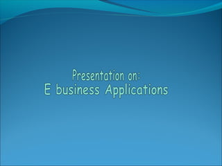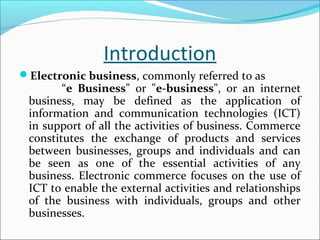 This document provides an overview of electronic business (e-business) and its applications. E-business utilizes information and communication technologies to support business activities both internally and externally. It focuses on using ICT to enable relationships between a business and individuals, groups, and other businesses. The web is a key tool for e-business, allowing businesses to attract customers through marketing and advertising, improve customer service, and expand their reach. E-business provides benefits like increased sales, reduced costs, and more accessibility and communication. Its applications include internal systems like CRM and ERP as well as e-commerce, supply chain management, and online/offline marketing. E-marketing, e-commerce, and e-business are related but
