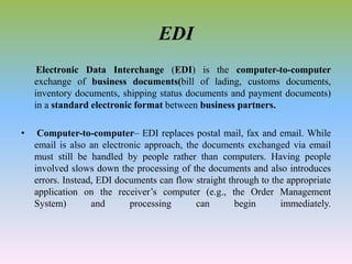 This document provides an overview of electronic data interchange (EDI). It discusses how EDI allows for the computer-to-computer exchange of standard business documents like purchase orders and invoices. It outlines the benefits of EDI, such as reduced costs, errors and time delays compared to paper-based systems. It also describes how EDI uses standards like ANSI X.12 and EDIFACT to facilitate information exchanges and how software is used to implement EDI between businesses.
