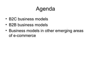 This document discusses various e-commerce business models, including B2C and B2B models. For B2C, it describes portal, e-tailer, content provider, transaction broker, market creator, service provider, and community provider models. For B2B, it discusses e-distributor, e-procurement, exchanges, and industry-wide networks. It also covers emerging models like C2C, P2P, and e-commerce enablers. Auctions are discussed as an online market mechanism where sellers offer goods and buyers bid until a final price is reached.