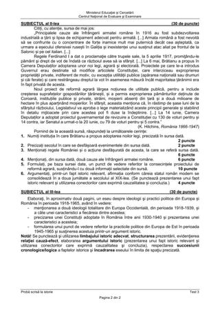 Documentul reprezintă un test scris pentru examenul de bacalaureat național 2020 la istorie, care conține întrebări bazate pe surse istorice referitoare la relațiile dintre Țările Române și Imperiul Otoman, precum și despre evenimente din prima jumătate a secolului XX. Testul include cerințe complexe, cum ar fi identificarea de domnitori, cauze ale conflictelor și reforme agrare, având un total de 90 de puncte disponibile. De asemenea, se solicită elaborarea unui eseu pe tema ideologiilor și practicilor politice din Europa și România între 1918 și 1965.