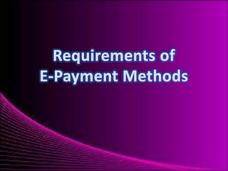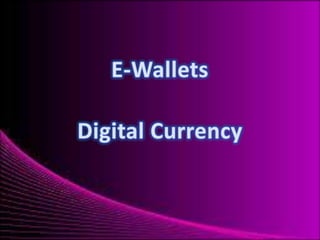 This document discusses various electronic payment methods including credit cards, debit cards, stored-value cards, digital currency, e-wallets, and peer-to-peer transfers. It notes that credit cards remain very popular for business-to-consumer transactions due to their convenience of paying later. While electronic payments can increase efficiency and lower transaction costs, challenges include a lack of tax records and increased risks of money laundering and forgery compared to cash payments.