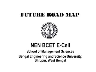 The document outlines the future road map and activities of the E-Cell at NEN BCET. It plans to actively recruit mentors from alumni entrepreneurs, faculty, and professionals. It will form an advisory body of lawyers, accountants, investors, and bankers. E-Cell will organize talks, workshops on developing small businesses. It will participate in other institutes' E-cell events and organize its own. The document details marketing, maintaining a website, publishing newsletters, and compiling entrepreneur stories. It structures the E-Cell with coordinators, mentors, faculty leaders, and managers for events, corporate relations, media, web development, and sponsorships.