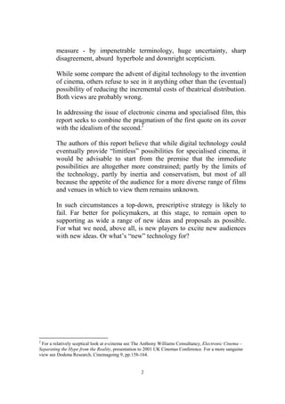 This report provides an overview of electronic cinema (e-cinema) and its potential relationship to distributing and exhibiting specialized films. E-cinema is defined as using digital technology to distribute and exhibit films and other moving images to communal audiences. While digital distribution could reduce costs and increase flexibility, widespread adoption of e-cinema faces barriers around technology limitations and costs of installing exhibition equipment. E-cinema may eventually allow distribution directly to more types of venues beyond traditional cinemas, but specialized cinemas are still expected to remain important for specialized film audiences.