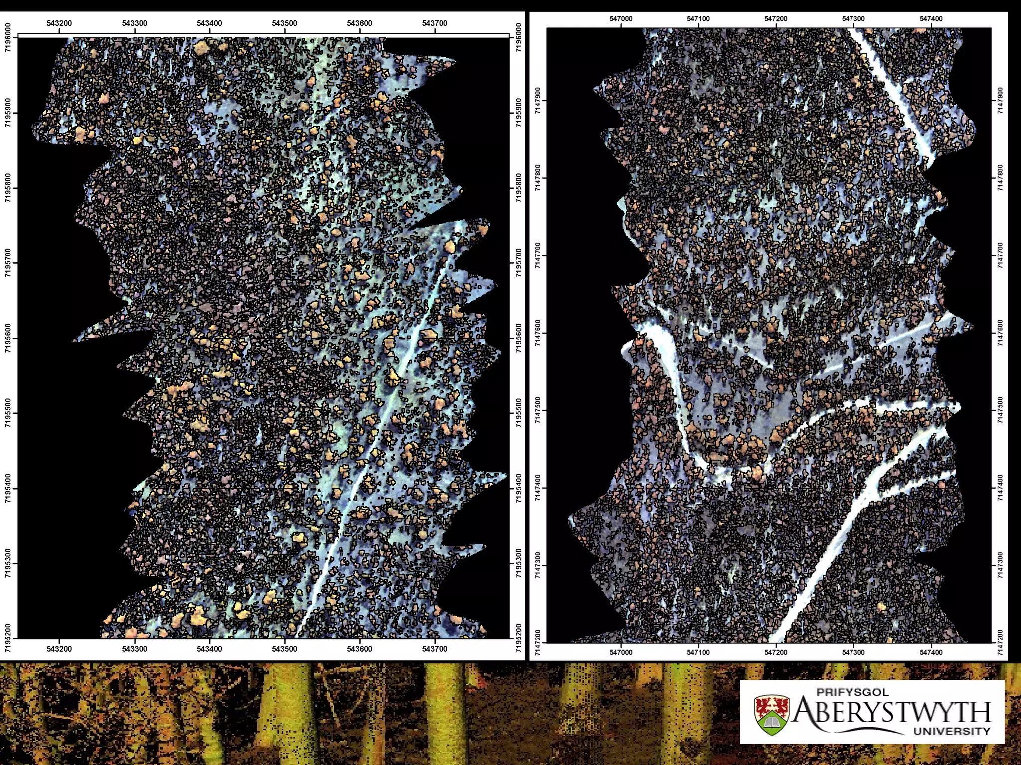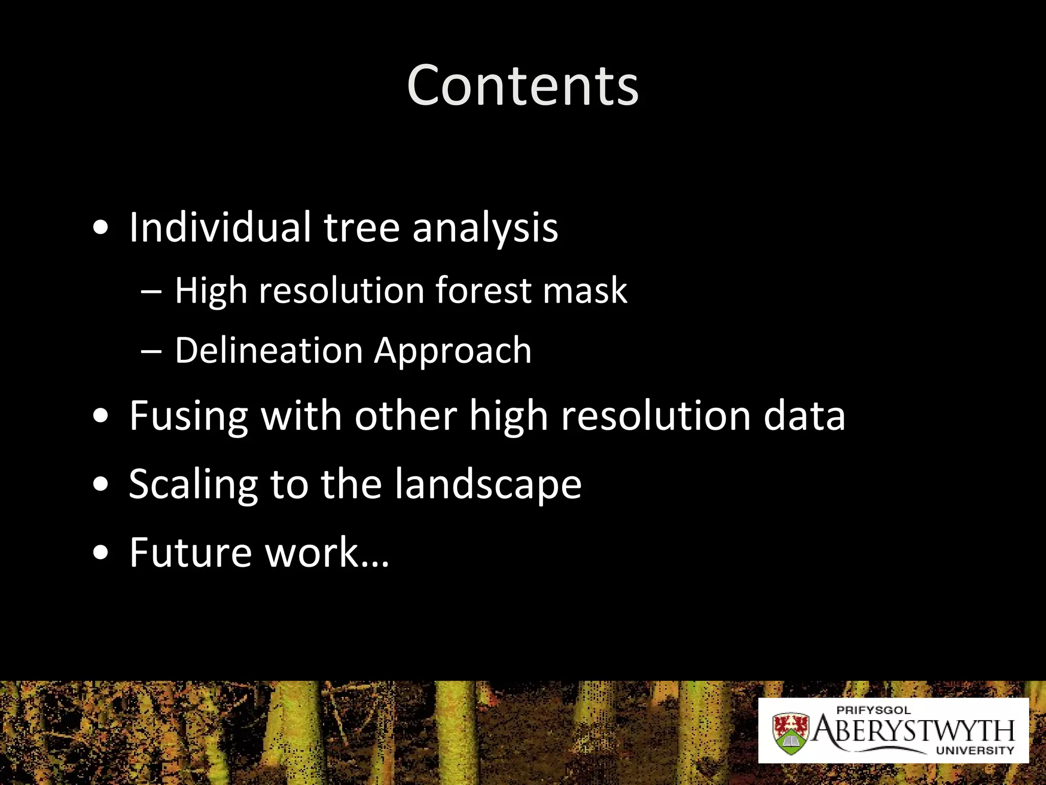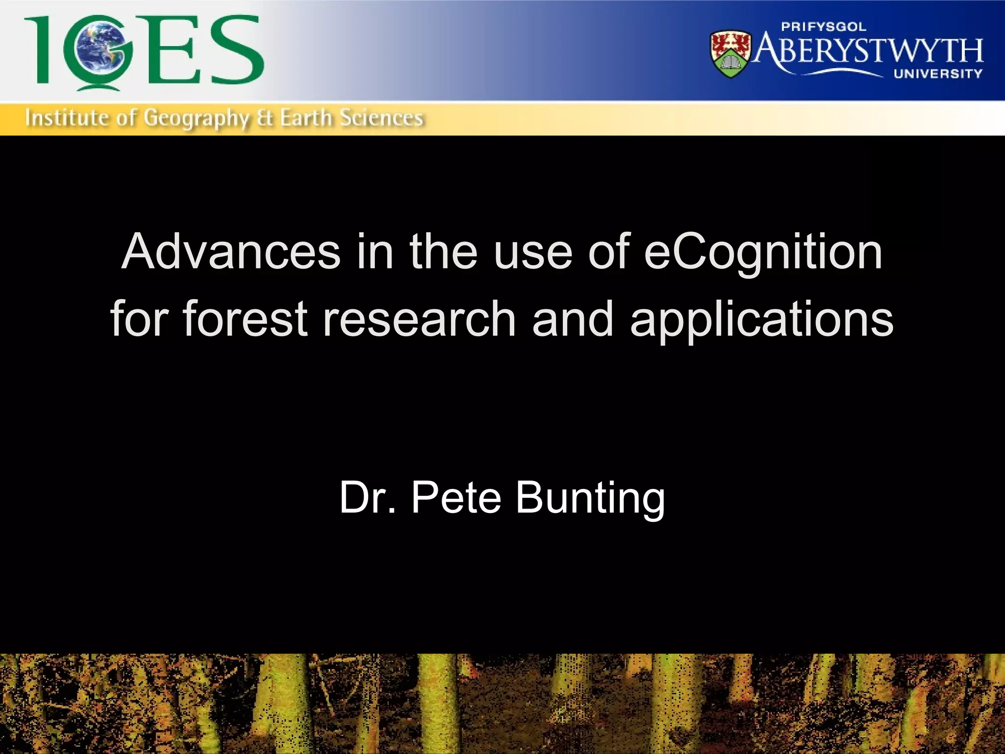 The document discusses advances in using eCognition software for forest research and applications. It describes individual tree analysis methods using high resolution imagery, including delineating tree crowns by removing non-forest areas and using hill and valley models. It also discusses classifying tree crowns using shape and spectral properties and associating delineated crowns with species types by extracting reflectance spectra. Future work mentioned includes observing long-term forest change using LiDAR data from different time periods.