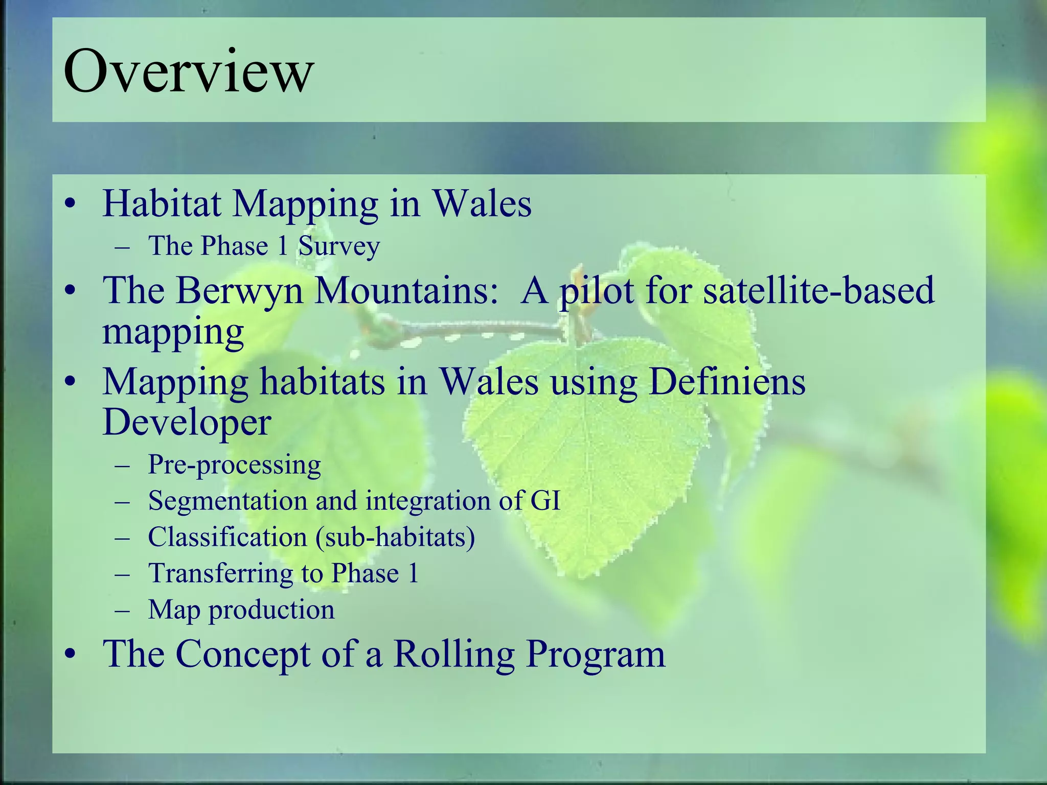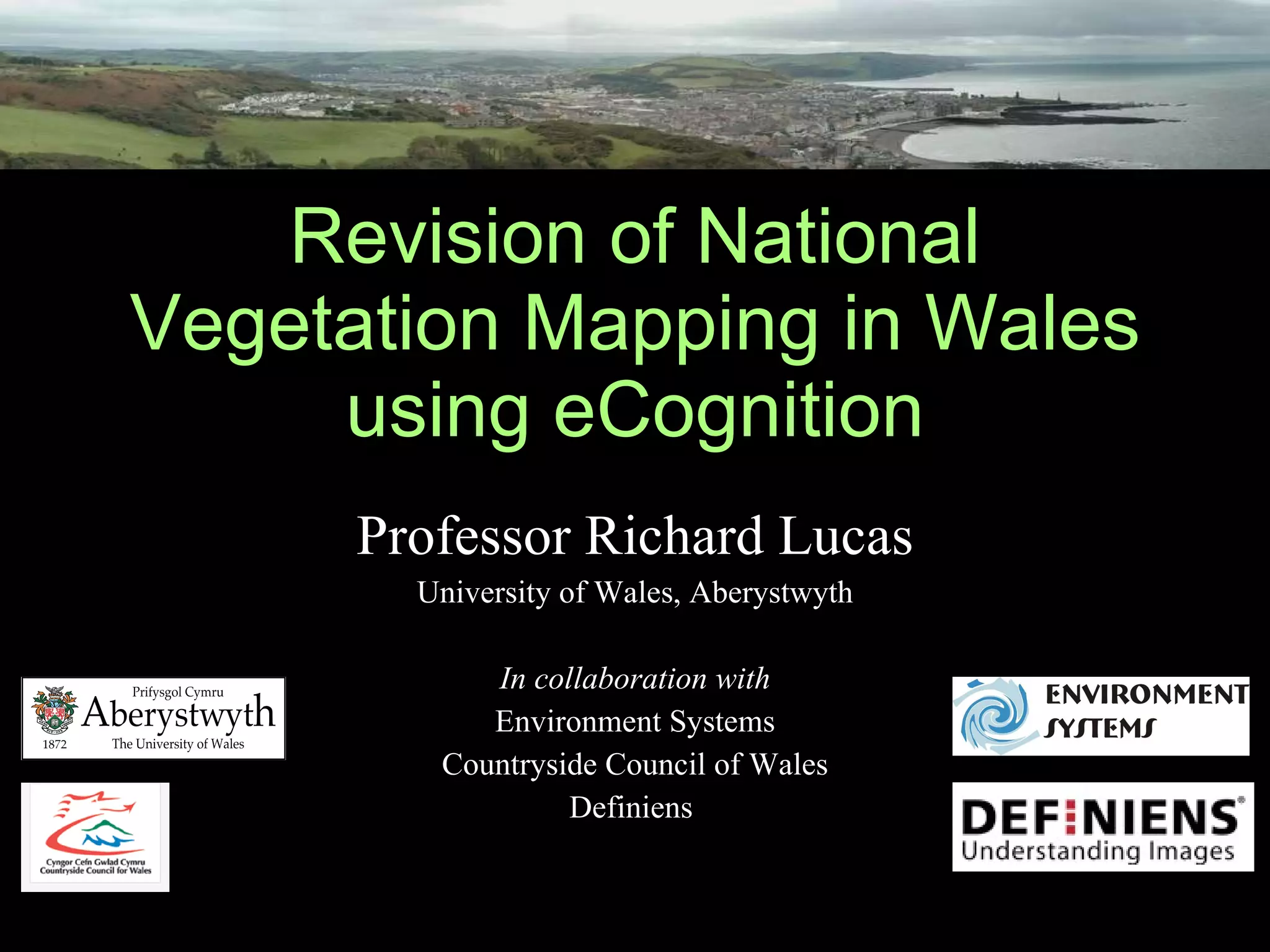 The document summarizes a project using object-based image analysis to revise national vegetation mapping in Wales. High-resolution satellite imagery from multiple sensors was segmented and classified using a rule-based approach in Definiens software to map habitats at multiple scales, achieving over 80% accuracy compared to existing maps. The project established a baseline habitat map for 2006 and is developing a rolling program to regularly update the maps using new imagery and refine the classification system.