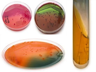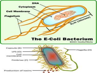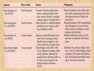 Escherichia coli is a common bacteria found in the intestines of humans and animals. While most E. coli strains are harmless, some can cause illness. There are several pathogenic types of E. coli including enterohemorrhagic E. coli (EHEC), enterotoxigenic E. coli (ETEC), enteroinvasive E. coli (EIEC), and enteropathogenic E. coli (EPEC). These pathogenic strains cause illnesses ranging from mild diarrhea to bloody diarrhea and even life-threatening complications like hemolytic uremic syndrome. Pathogenic E. coli are identified through tests of their genetic and phenotypic characteristics.