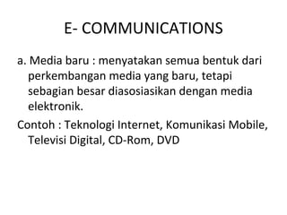 Dokumen tersebut membahas mengenai e-communication dan relationship marketing. E-communication meliputi penggunaan internet, telepon seluler, televisi interaktif dalam komunikasi pemasaran untuk tujuan penjualan langsung, pelayanan pelanggan, dan pembentukan hubungan dengan pelanggan. Relationship marketing bertujuan membangun hubungan jangka panjang dengan pelanggan untuk meningkatkan loyalitas melalui kepuasan dan kepercayaan. Database pemasaran digunakan untuk mengelola informasi pelang