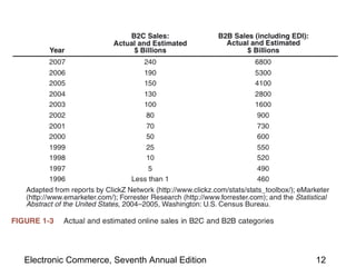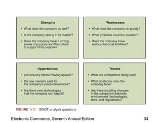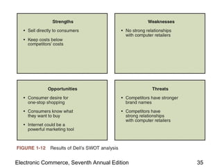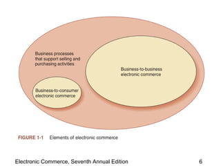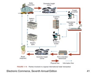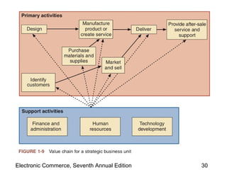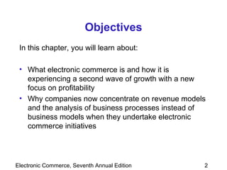 This chapter introduces electronic commerce and discusses the key aspects of its second wave. It covers how businesses now focus on revenue models and process analysis over broad business models for e-commerce initiatives. It also explores how economic forces have fostered the second wave and how businesses can identify opportunities through value chain and SWOT analyses. The global nature of e-commerce is discussed along with challenges of conducting international business online like cultural, language, infrastructure and legal differences across borders.