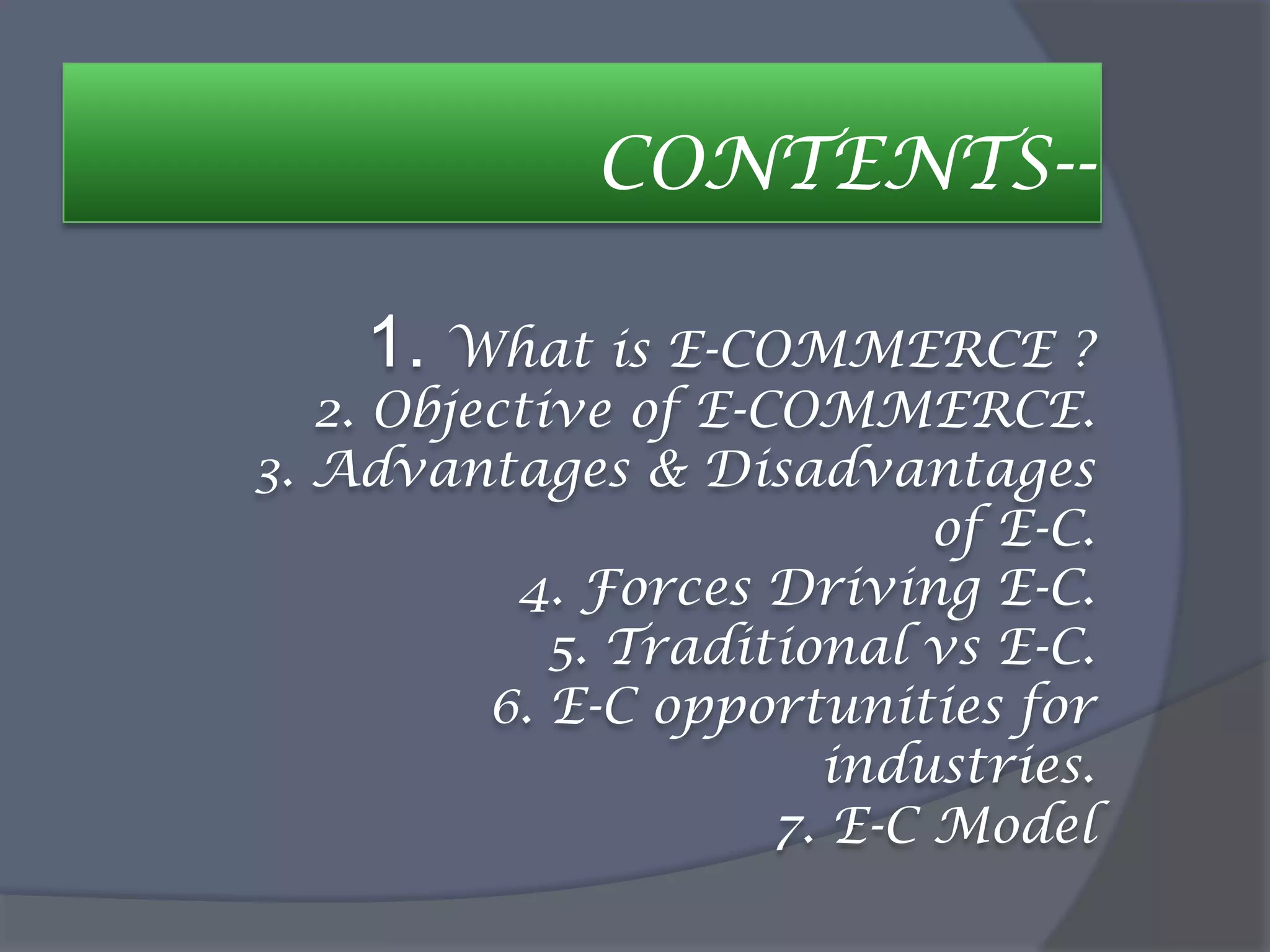 This document provides an overview of e-commerce. It defines e-commerce as buying and selling of products or services over electronic systems like the Internet. Some key points covered include: