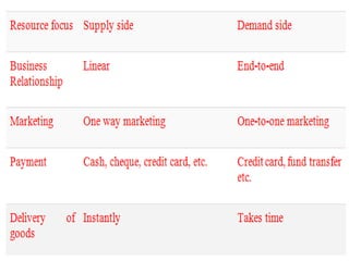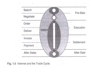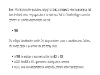 The document provides an overview of e-commerce, including definitions and explanations of key terms. It discusses traditional commerce and how e-commerce differs, focusing on how electronic networks like the internet enable firms and individuals to conduct business. The document also outlines several e-commerce models (B2B, B2C, etc.), advantages and disadvantages, and how e-commerce has impacted organizational structures and human resource management practices through digital transformation.