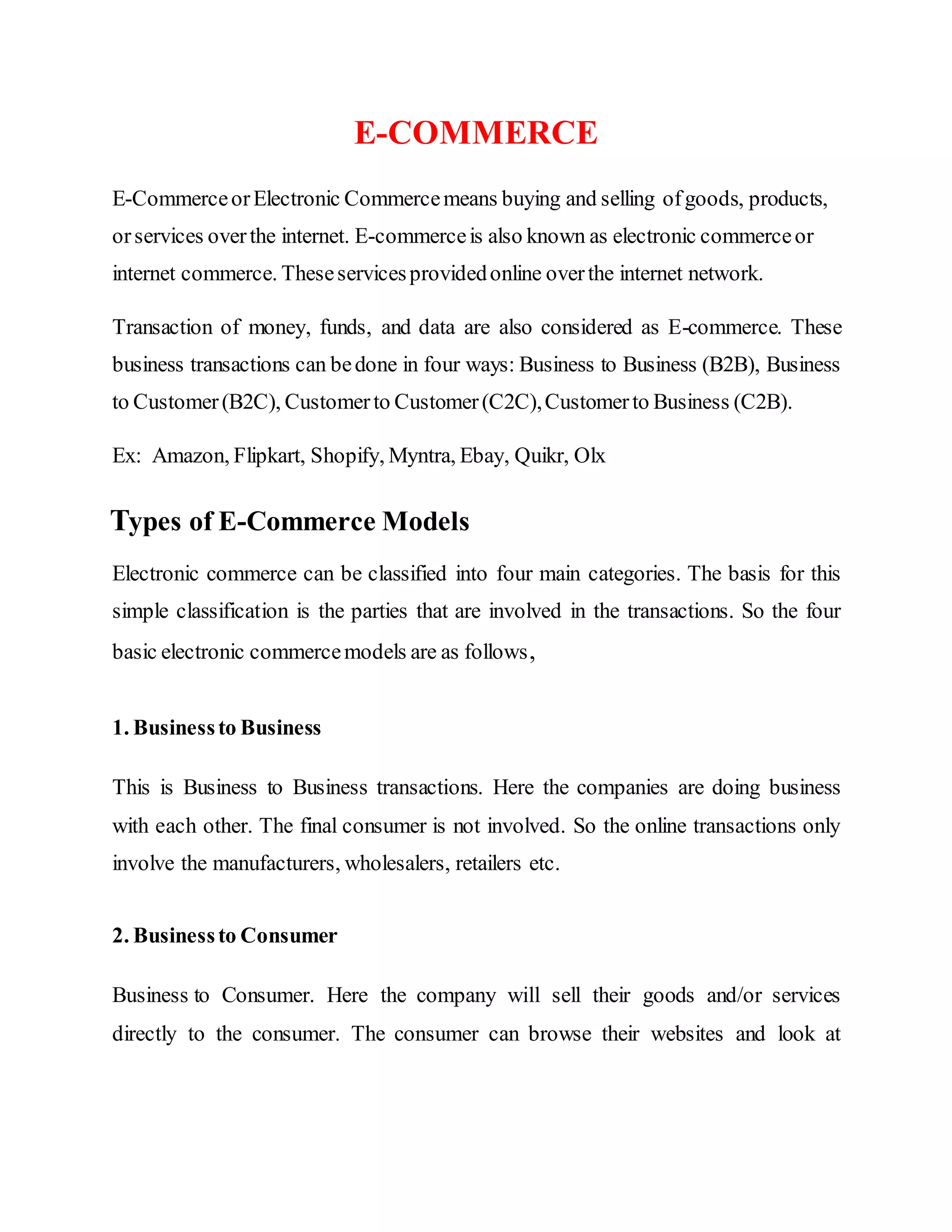 E-commerce, or electronic commerce, involves buying and selling goods and services over the internet and can be categorized into four models: business-to-business (B2B), business-to-consumer (B2C), consumer-to-consumer (C2C), and consumer-to-business (C2B). The Indian e-commerce market is projected to grow significantly, reaching $200 billion by 2026, driven by factors such as increasing smartphone penetration and government initiatives. While e-commerce offers advantages like global reach and convenience, it also faces challenges including high start-up costs, security concerns, and a lack of personal touch in customer interactions.