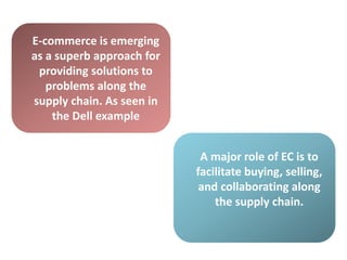 E-commerce is emerging as a way to provide solutions to problems along the supply chain. It facilitates buying, selling, and collaborating between partners in the supply chain. While integrating e-commerce with existing ERP systems leverages prior investments, such integration can be difficult due to the complexity and inflexibility of ERP systems. Order fulfillment is a key area that sometimes faces problems with e-commerce supply chains, especially for B2C transactions, but innovative solutions around delivery times and returns processing are helping to address these issues.