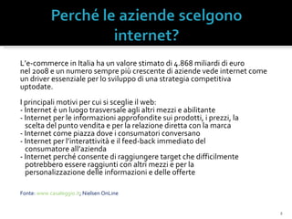 L'e-commerce in Italia ha visto un significativo valore nel 2008 e offre opportunità strategiche per le aziende, sebbene ci sia una reticenza nell'adottare modelli multicanale. Le categorie fisiche e l'abbigliamento stanno crescendo, ma è necessario superare un ritardo culturale nel marketing esperienziale. I vantaggi dell'e-commerce comprendono l'interattività e la personalizzazione, ma sono presenti anche svantaggi come l'incertezza sulla consegna e la mancanza di interazione personale.