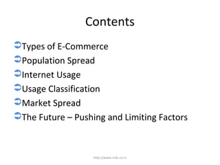 The document presents an overview of e-commerce in India, detailing various types such as B2B, B2C, C2C, C2B, and m-commerce, along with government participation in e-commerce. It states that about 25% to 30% of India's population are active e-commerce customers, driven by increasing internet usage and the growth of online services. The future of e-commerce is promising, with expected growth in online transactions, despite challenges related to credibility and cost for businesses.