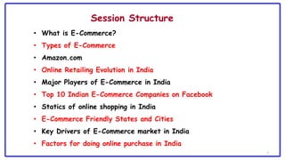 This document provides an overview of e-commerce in India. It defines e-commerce and describes the different types including B2B, B2C, C2B, and C2C models. It discusses the major players in Indian e-commerce like Flipkart, Snapdeal, and Myntra. It also covers topics like the evolution of online retailing in India, statistics on online shopping in India, key drivers of the e-commerce market, and future trends in areas like mobile commerce. The document concludes with sections on payment gateways, legal and regulatory aspects, and investments in the Indian e-commerce sector.