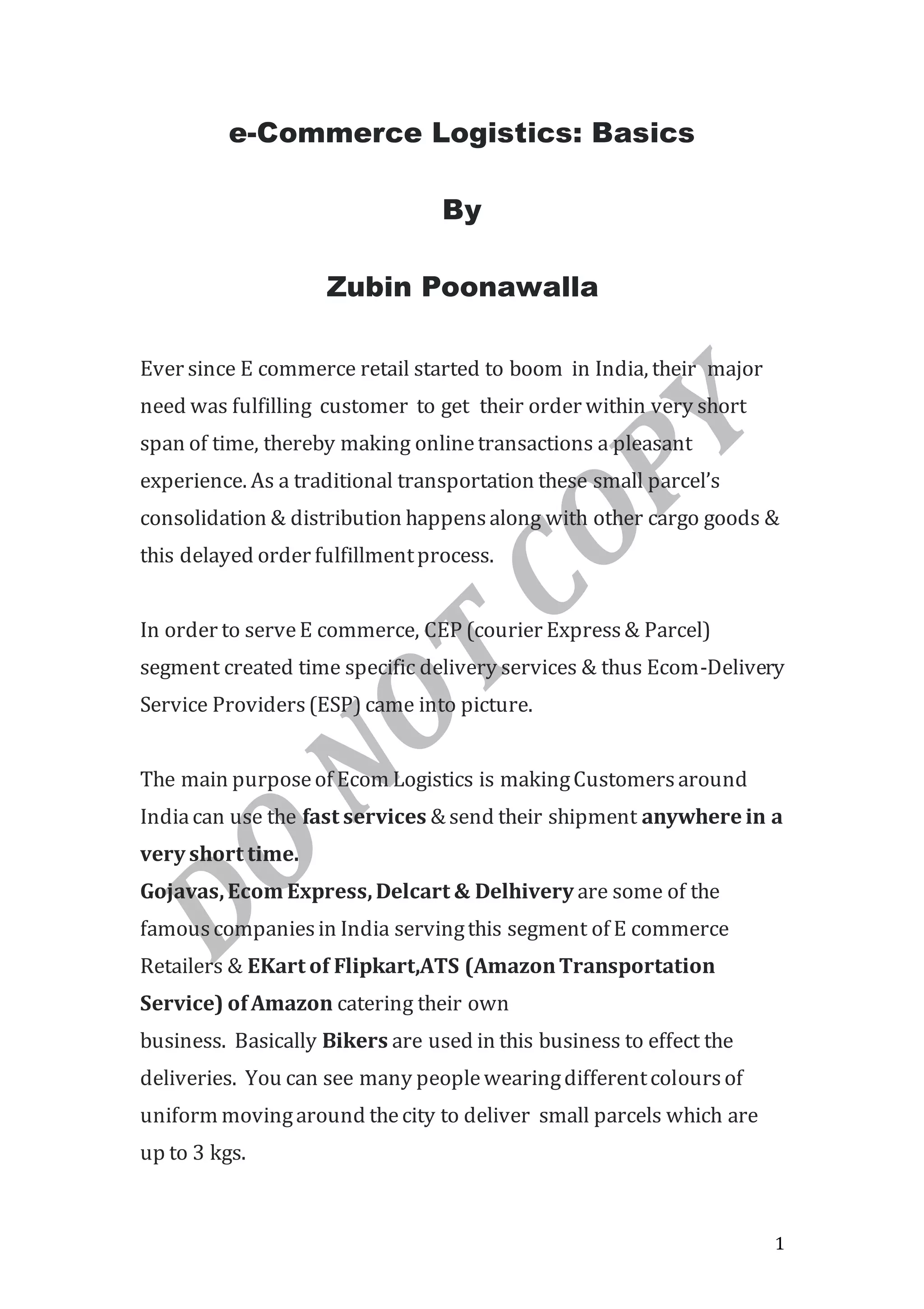 E-commerce logistics involves efficient delivery of small parcels to customers within a short time period. Courier, express and parcel companies created time-specific delivery services to facilitate e-commerce, giving rise to e-commerce delivery service providers. These providers use various methods like bikers, direct networks, and hub-and-spoke models to pick up shipments from fulfillment centers, transport them via different modes, and deliver through localized networks. Advanced technologies help track shipments, notify customers, and provide services like cash on delivery and returns to enhance customer experience and drive repeat online transactions. As e-commerce grows, logistics providers must continually update technologies to efficiently handle deliveries and compete in the market.