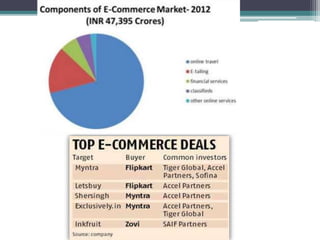The document discusses e-commerce mergers and acquisitions in India. It notes that the e-commerce market in India is currently worth $2.5 billion but is expected to reach $20 billion in the next 5 years. It then examines the Flipkart-Myntra deal, where Flipkart acquired Myntra for $300 million. The acquisition allows both companies to operate separately while combining Flipkart's logistics network with Myntra's fashion business and online market share. The merger of the two companies aims to capture over 50% of the online fashion market in India.