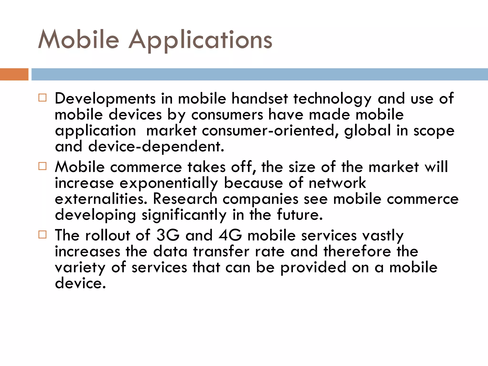 Mobile application markets have grown significantly due to increased use of mobile devices and advances in mobile technology. As mobile commerce expands, the size of the app market is expected to grow exponentially. There are now thousands of apps available across various app stores and mobile platforms, with total industry revenues estimated to reach $27 billion by 2013. While Apple currently dominates the market, analysts predict its share will decrease to 15% by 2015 as third-party app stores capture a larger portion of sales.