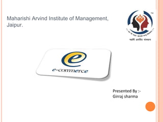 The document provides an overview of e-commerce, defining it as the buying and selling of goods and services over electronic systems like the internet. It discusses the history, types (B2B, B2C, B2E, C2C), advantages, and disadvantages of e-commerce. The conclusion emphasizes the need for businesses to adapt to consumer trends and leverage e-commerce for success in an evolving technological landscape.