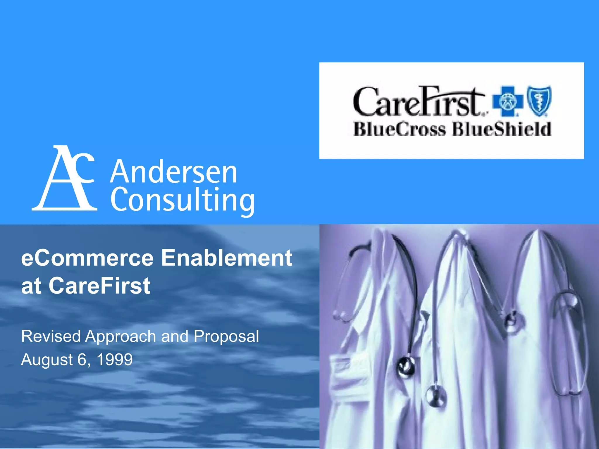 The document proposes an eCommerce enablement approach and plan for CareFirst, an insurance provider, to realize over $100 million in annual savings and revenue. It recommends a two-phase approach to quickly scope high-value opportunities, design architectures, and develop a business case to launch pilot capabilities by the fourth quarter of 1999. Andersen Consulting proposes assisting CareFirst for $700,000 to help them advance their eCommerce capabilities and strategic position relative to competitors.