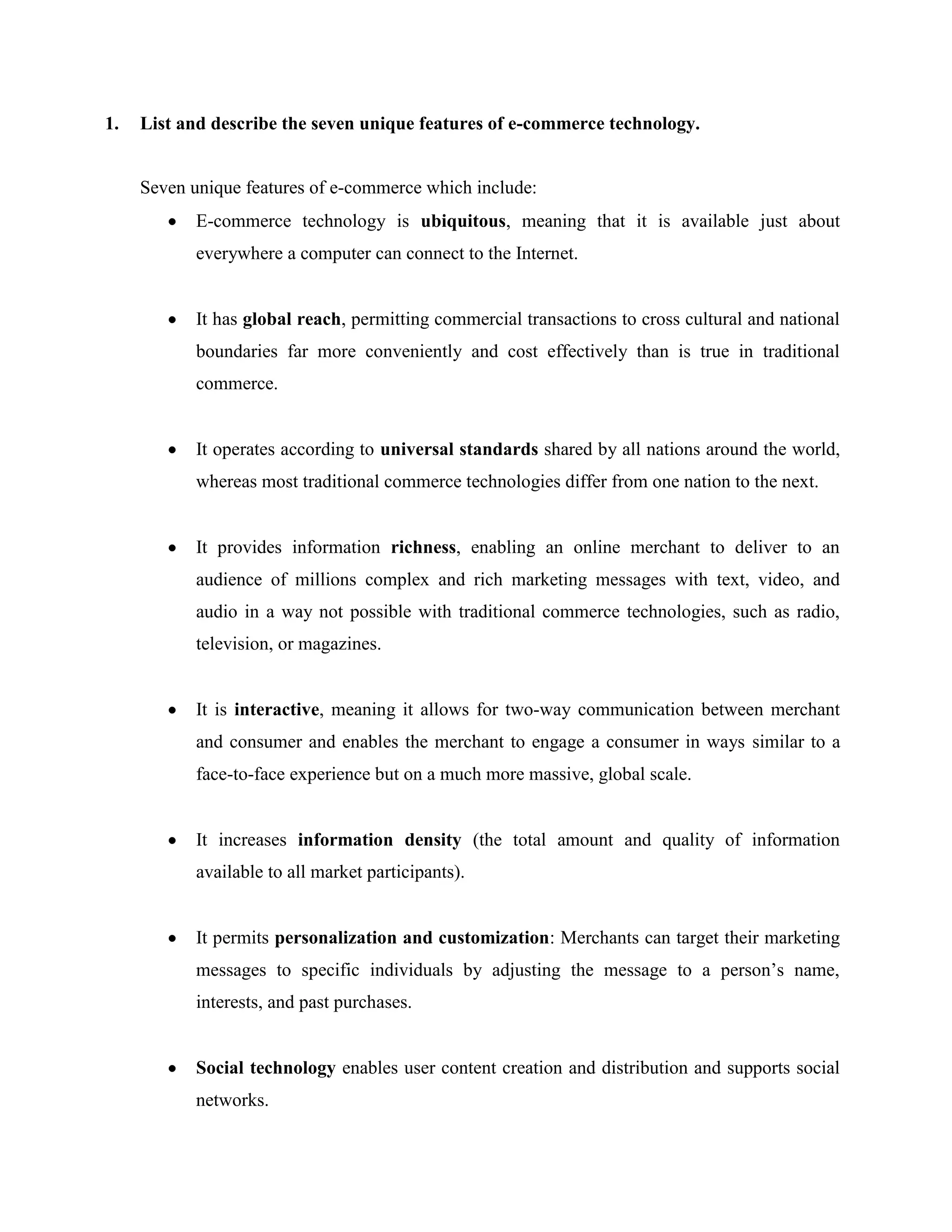 The document discusses several topics related to e-commerce. It begins by listing seven unique features of e-commerce technology: ubiquity, global reach, universal standards, information richness, interactivity, increased information density, and personalization. It then defines a digital market as one with reduced information asymmetry, flexibility, efficiency and direct consumer sales. Digital goods are described as products delivered over digital networks with low marginal costs of production and delivery. The document also explains how the Internet reduces information costs and disrupts traditional business models, enabling new models like virtual storefronts, information brokers, and online marketplaces. Finally, it distinguishes pure-play Internet businesses from clicks-and-mortar businesses that have both online and physical pre