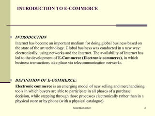 This document provides an overview of key concepts related to e-commerce including definitions of e-commerce, classifications of e-commerce applications, types of e-commerce, benefits and limitations of e-commerce, and technologies that enable e-commerce such as HTML, TCP/IP, and data warehousing. It also discusses driving forces behind the growth of e-commerce and infrastructure requirements for e-commerce networks.