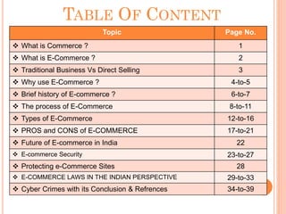 This document provides an overview of e-commerce, including definitions, history, processes, types, pros and cons, security concerns, and relevant laws in India. It discusses how e-commerce works by outlining the process from a customer's perspective of browsing a site, adding items to a cart, and completing a purchase. It also covers key topics like payment security, risks of data theft, and how laws like the Information Technology Act of 2000 aim to facilitate e-commerce transactions and address cybercrimes in India.