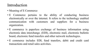 The document discusses e-commerce, which refers to conducting business electronically, emphasizing its global reach and efficiency. It details the legal framework surrounding electronic contracts and signatures in India, established by the Information Technology Act of 2000 and the Indian Contract Act of 1872, along with their implications. Additionally, it addresses various forms of e-commerce, benefits, and legal challenges relating to electronic transactions and contracts.