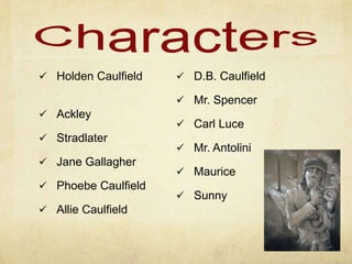 The document is a PowerPoint presentation that summarizes The Catcher in the Rye by J.D. Salinger. It outlines the main characters including Holden Caulfield, plot which follows Holden in New York City as he matures, and themes of loss of innocence and rebellion against society. Motifs like loneliness and symbols like Holden's hunting cap are also discussed. Biographical information is provided about author J.D. Salinger, and citations are listed at the end.