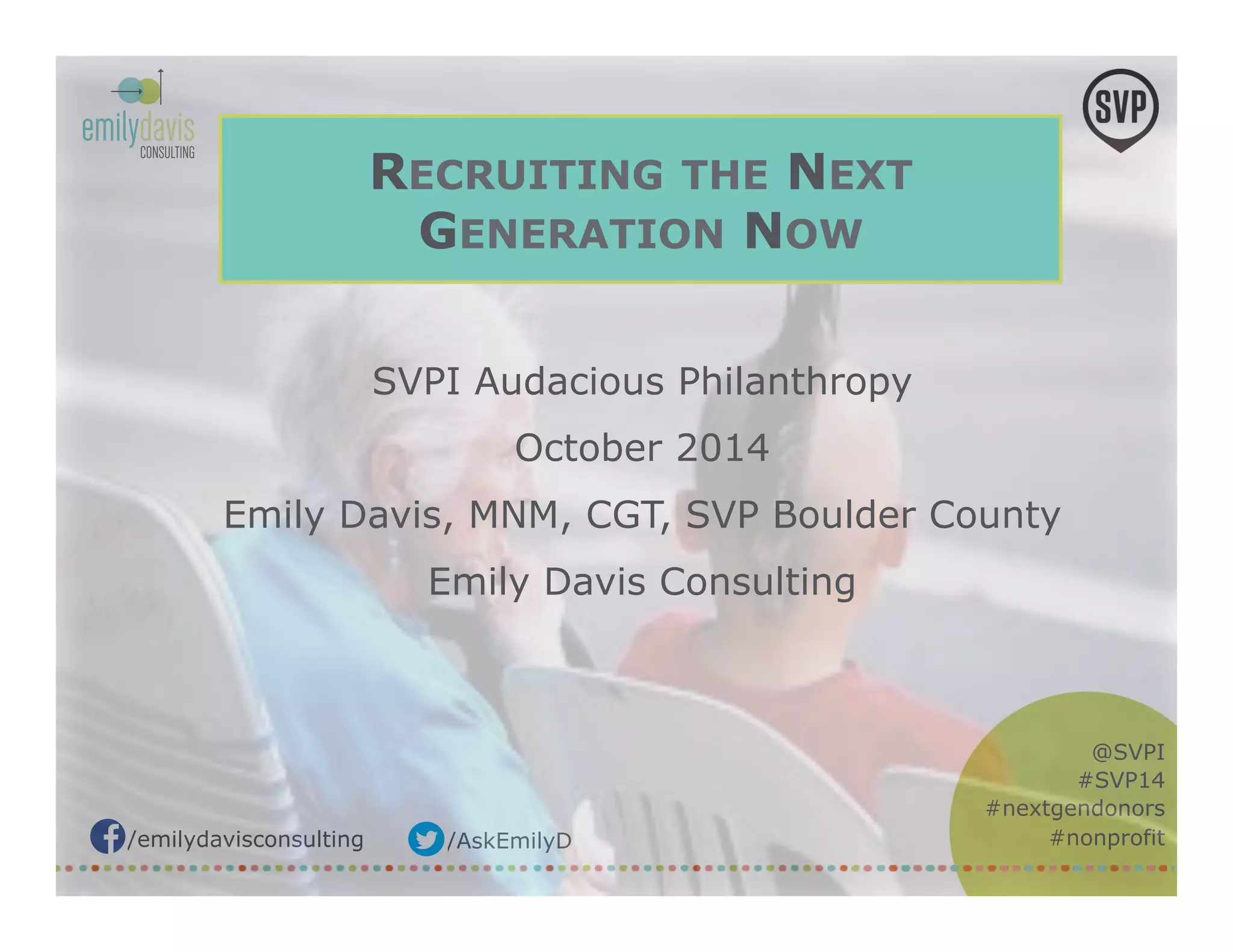The document discusses strategies for non-profits to recruit and engage donors from different generations. It provides an overview of the characteristics of Traditionalists, Boomers, Generation X, and Millennials. Non-profits need to understand generational differences in management styles, work styles, and motivations to effectively recruit and retain volunteers and donors from multiple generations. The document also discusses the importance of social media and new technologies to engage younger generations and shares tips for implementing generational philanthropy strategies.