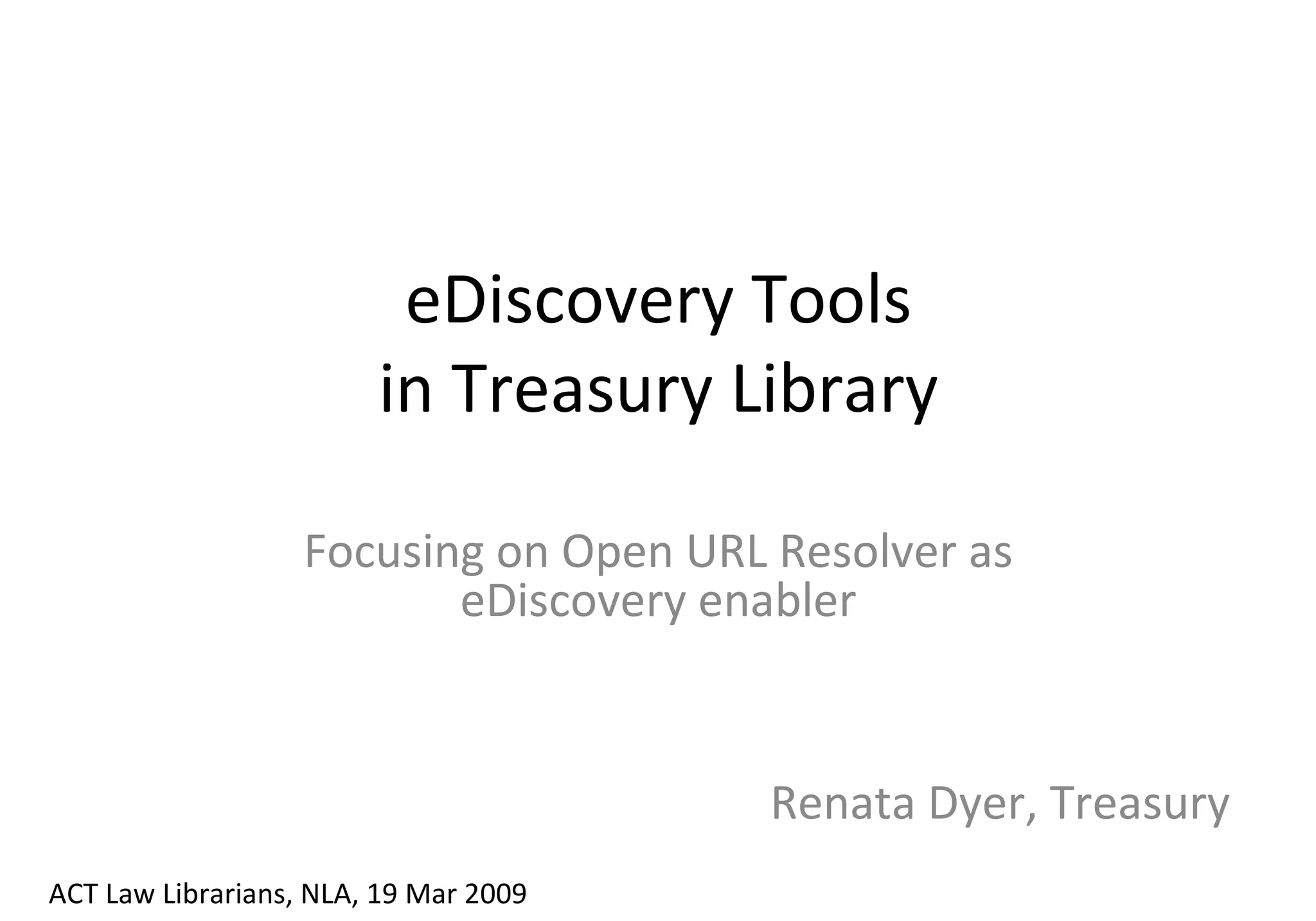 The document discusses eDiscovery tools used in the Treasury Library, with a focus on the OpenURL resolver. The OpenURL resolver allows users to discover additional full text journal articles and resources by integrating searches across multiple subscribed databases. It provides options to access full text, save citations, or request documents through interlibrary loan. While it does not search databases itself, the OpenURL resolver streamlines discovery by enabling links between related records across different sources. The Treasury Library uses the resolver along with an eResources portal, MARC records, and links to discovery tools like Libraries Australia and Google Scholar to optimize access to electronic holdings.