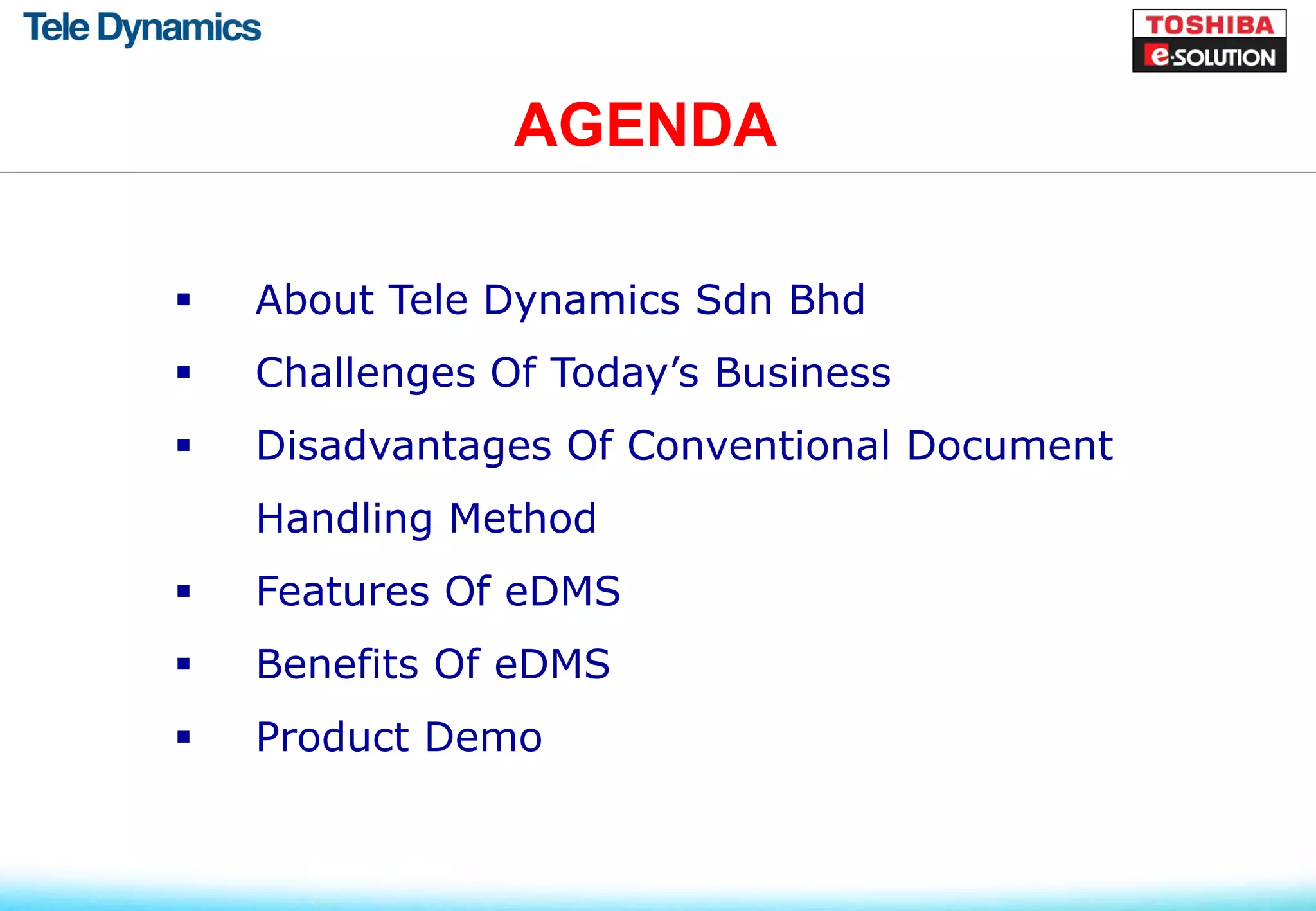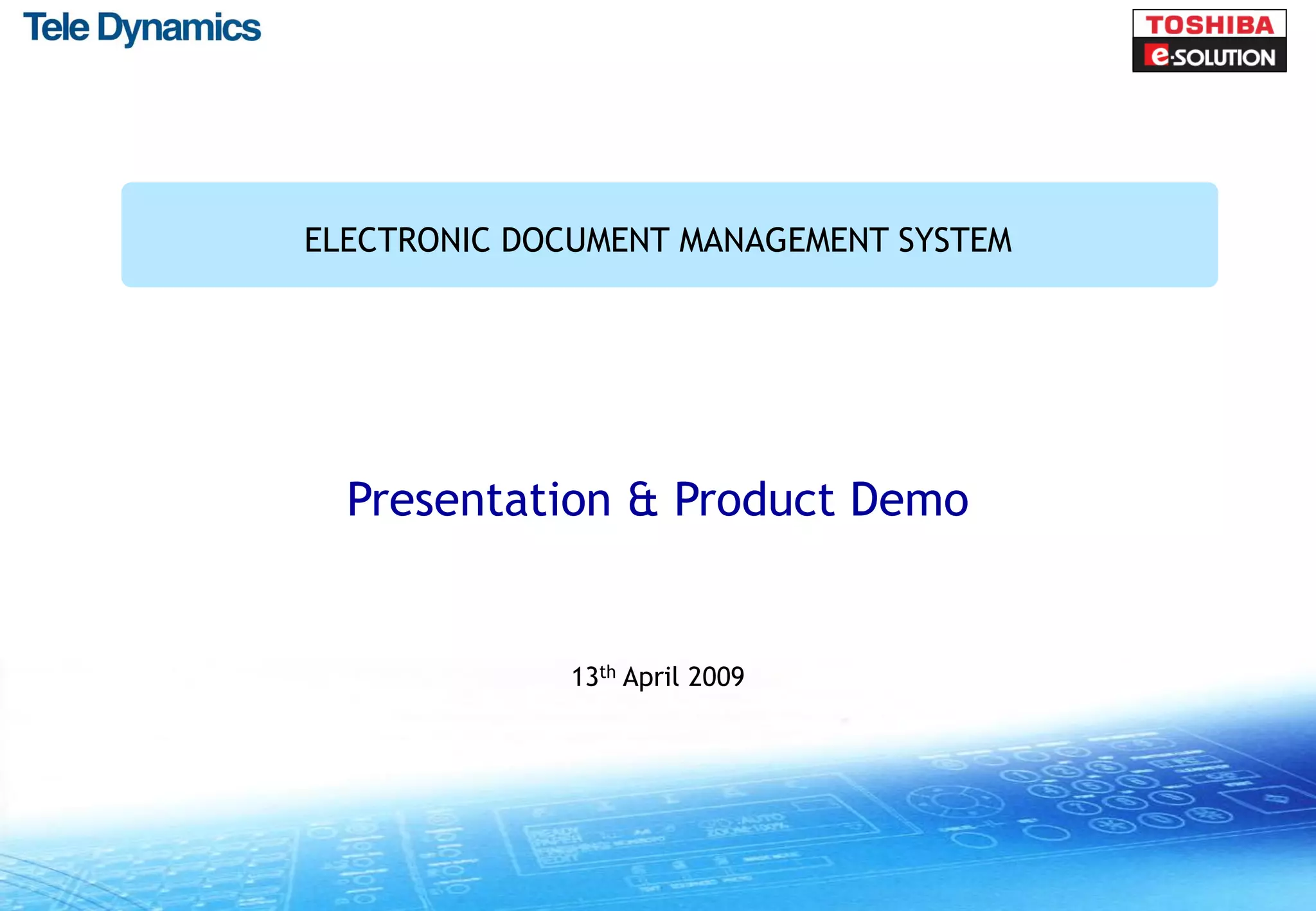 The document discusses an electronic document management system (eDMS) product demonstration. It outlines challenges of conventional document handling methods like high storage costs, difficulty retrieving documents, and redundancy. The presentation agenda includes information on Tele Dynamics Sdn Bhd, features of eDMS like centralized digital storage and full-text search, and benefits like increased productivity and reduced costs. It demonstrates eDMS workflow and integration with other systems.